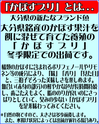 ■かぼすブリとは... 大分県銘産のかぼすを餌に混ぜて育てた養殖の「かぼすブリ」 旬を迎える冬季限定での出荷となります。